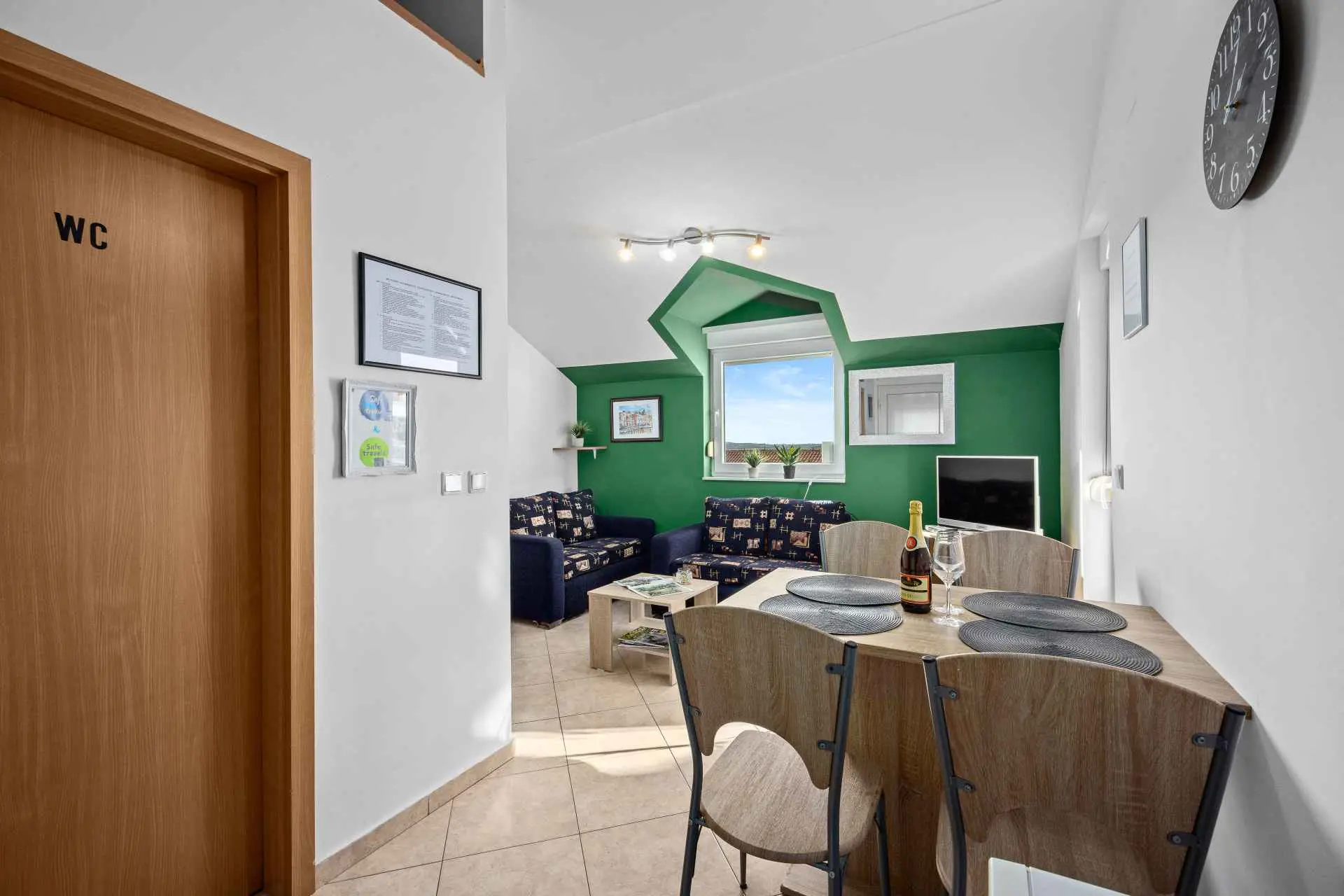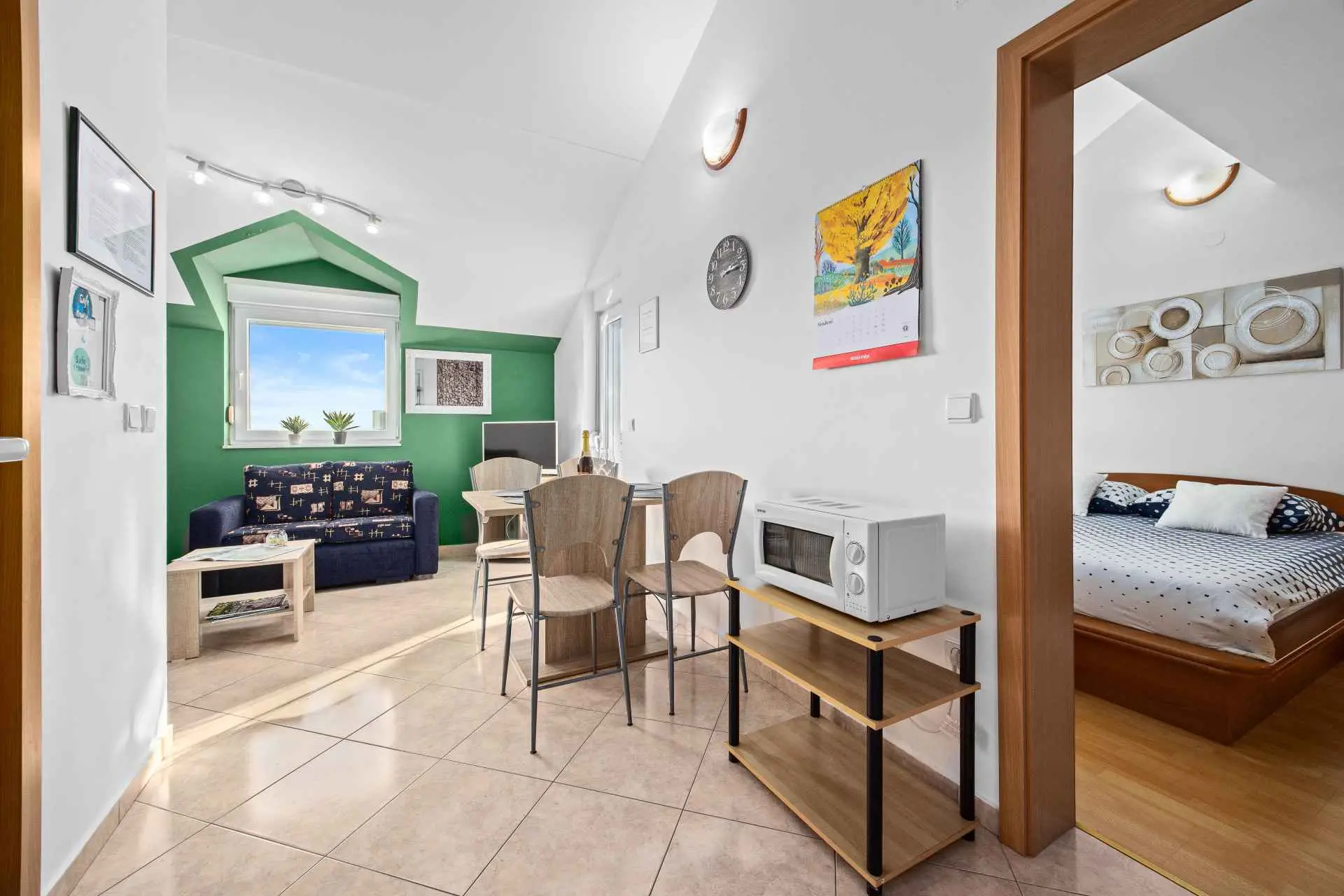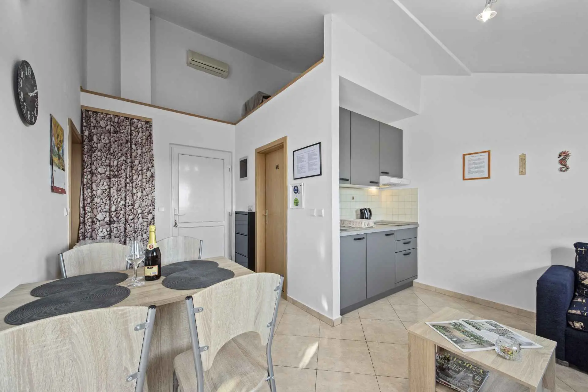 Medulin, eenkamer nieuw appartement van 35 m2 op de derde verdieping (2 + 2). Het appartement heeft een aparte slaapkamer, badkamer, hal, woonkamer met keuken en een mooie loggia. Het appartement is luchtig en heeft een zeezicht. Het is 700 m van de zee. Er zijn een paar discotheken en cafés voor jongeren in de buurt, evenals een funfair en een familiepark, en voor de ouderen is er live muziek op zomerse terrassen. Winkels, restaurants, postkantoor, bank, apotheek, benzinestation en alle andere inhoud vindt u in de nabijheid van het appartement. Medulin is een bekende toeristische stad, 10 km ten zuidoosten van Pula, in het noordoosten van de Medulin baai. Zuidoost van de nederzetting is het schiereiland Kašteja met zandstranden en dennenbossen. Op het schiereiland is een groot kamp te vinden. Op de kaap Kašteja zijn er resten van een prehistorische fort nederzetting, en op het schiereiland Vižula was er een nederzetting in de periode van het oude Neolithicum. Overblijfselen van Romeinse villa's (Villae Rusticae) zijn ontdekt aan de kust. Op de berg Vrcevan (71 m) zijn resten van het prehistorische leven gevonden. De kerk van St. Agnes in Medulin is erg interessant, het heeft twee identieke torens (klaar in 1912). Toerisme heeft sterk invloed op de ontwikkeling van Medulin.