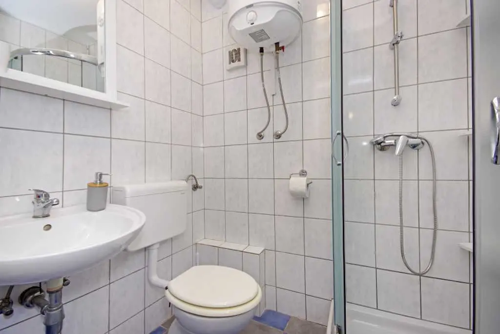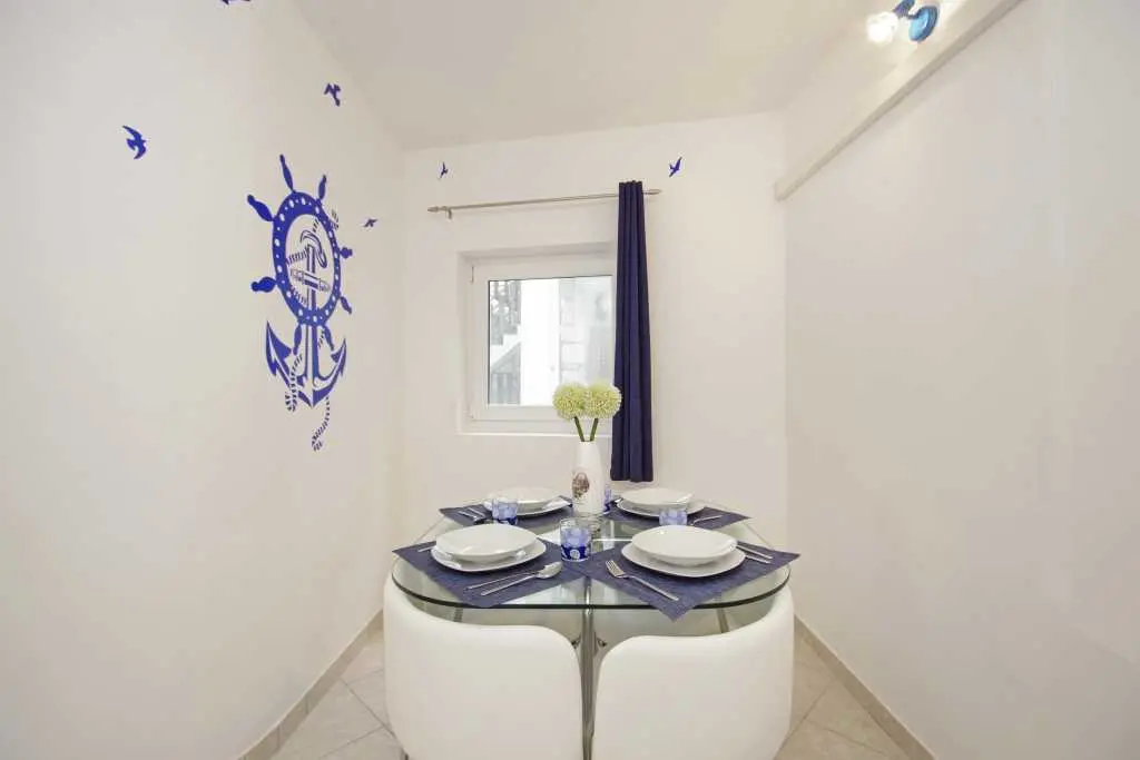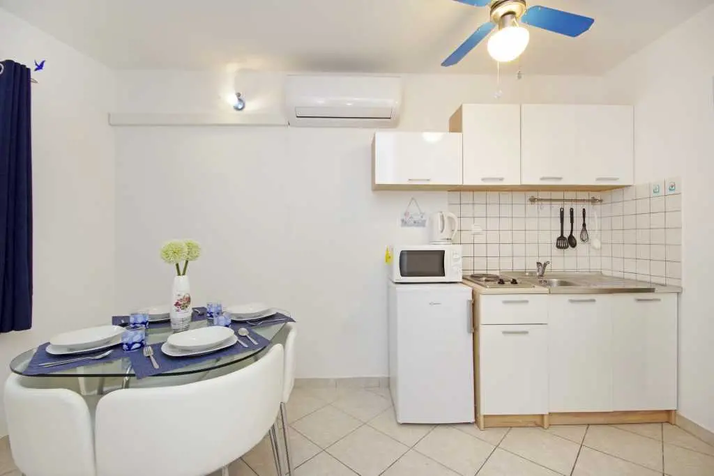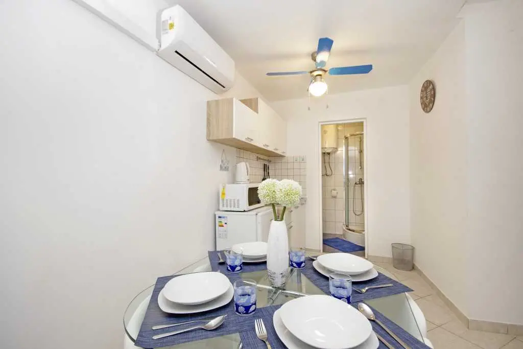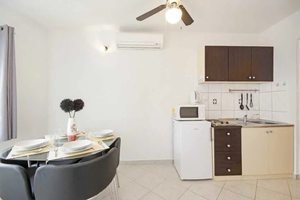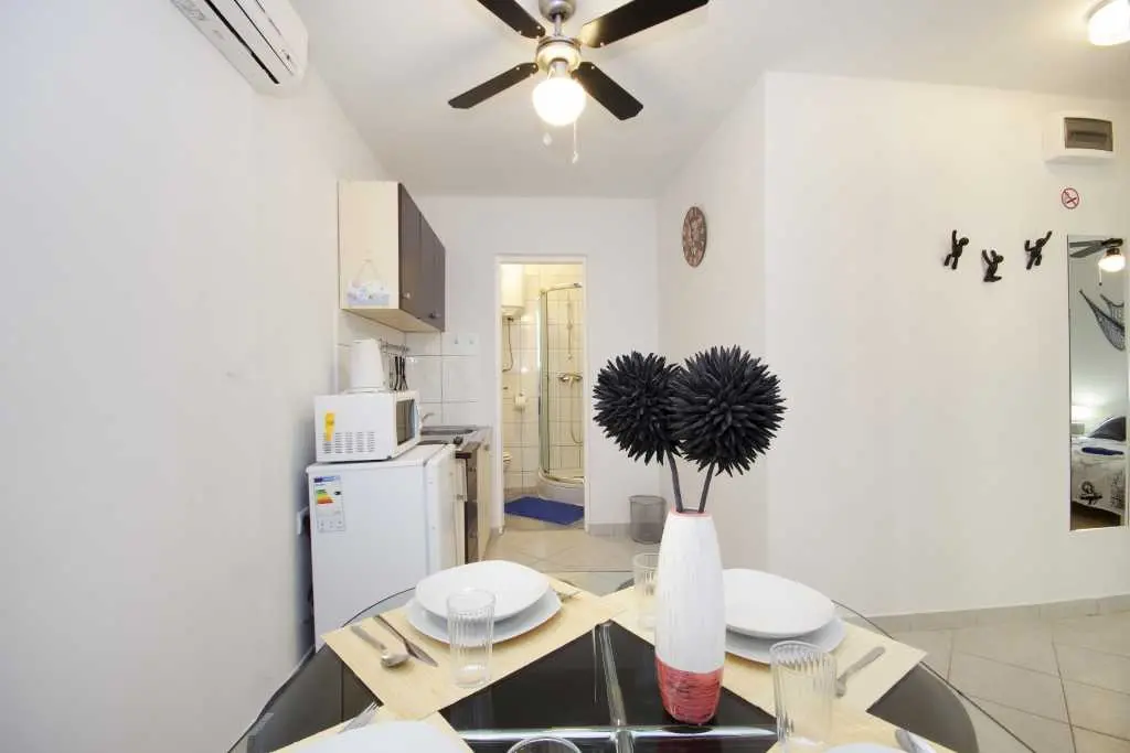 Appartementen van 33 m2 zijn gecategoriseerd met 3 * en bevinden zich op de eerste en tweede verdieping van een stenen huis. Ze hebben wi-fi, airconditioning, sat / tv (flatscreen), alle ramen hebben een klamboe. Eetkamer / open keuken - Plafondventilator, 2 elektrische kookplaten, magnetron, koelkast (vriezer), waterkoker, servies en bestek - op aanvraag; Babyvoeding stoel. Kamer - tweepersoonsbed 190x160 (cm), nachtkastjes, kledingkast, plafondventilator, lage kast Extra bed 200x90 (cm). Op verzoek; babybedje. Badkamer - spiegel en wastafel, douche, toilet. Het appartement heeft een parkeerplaats op 20 m van het huis.