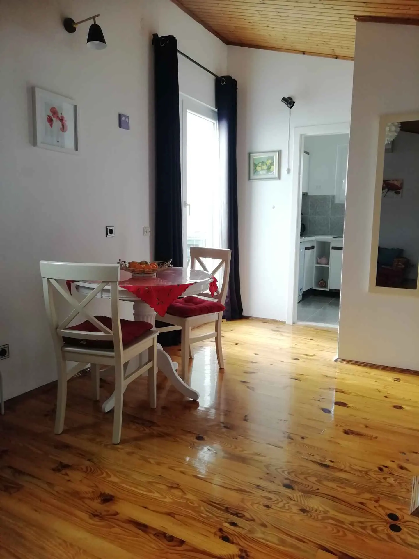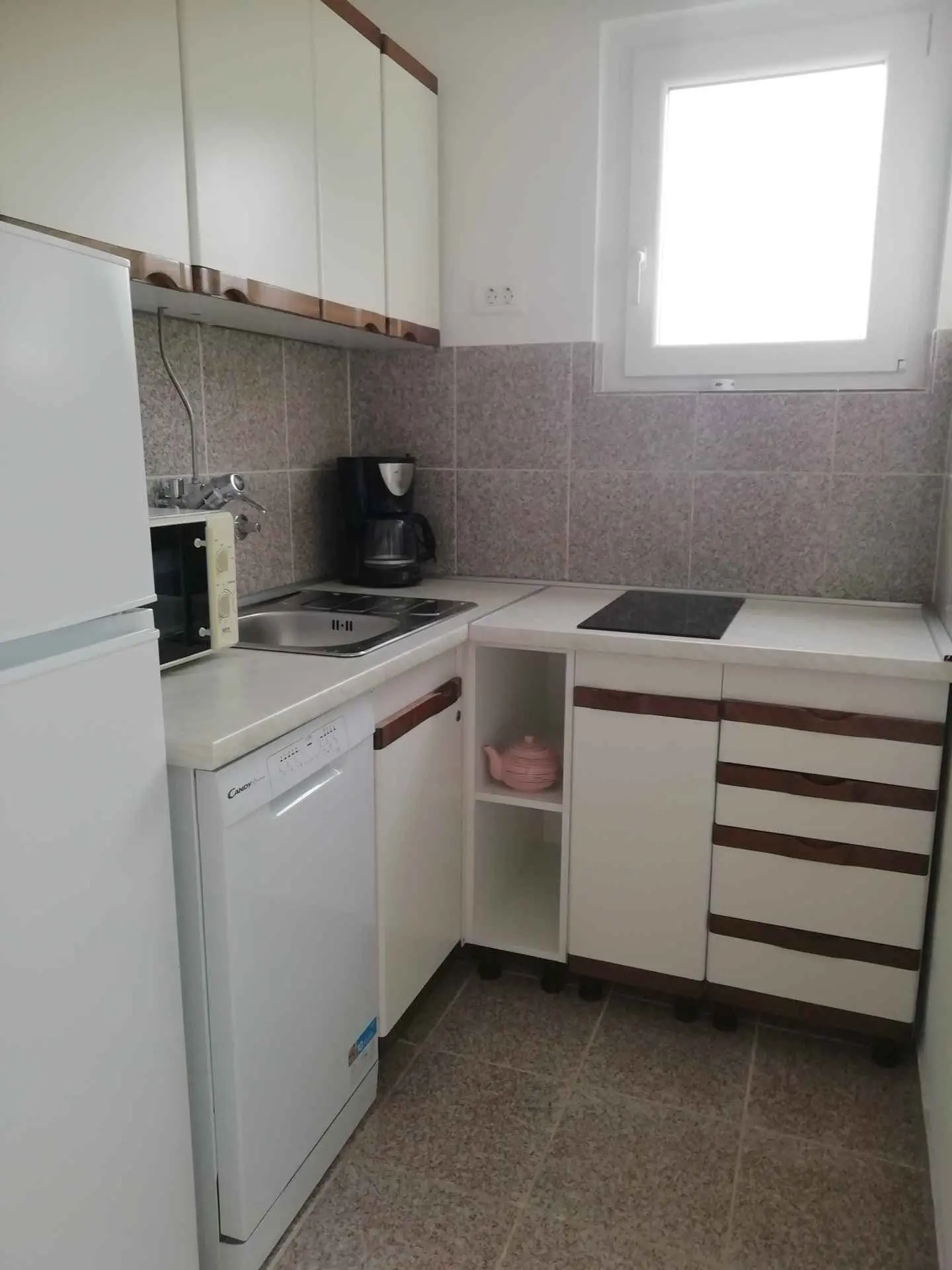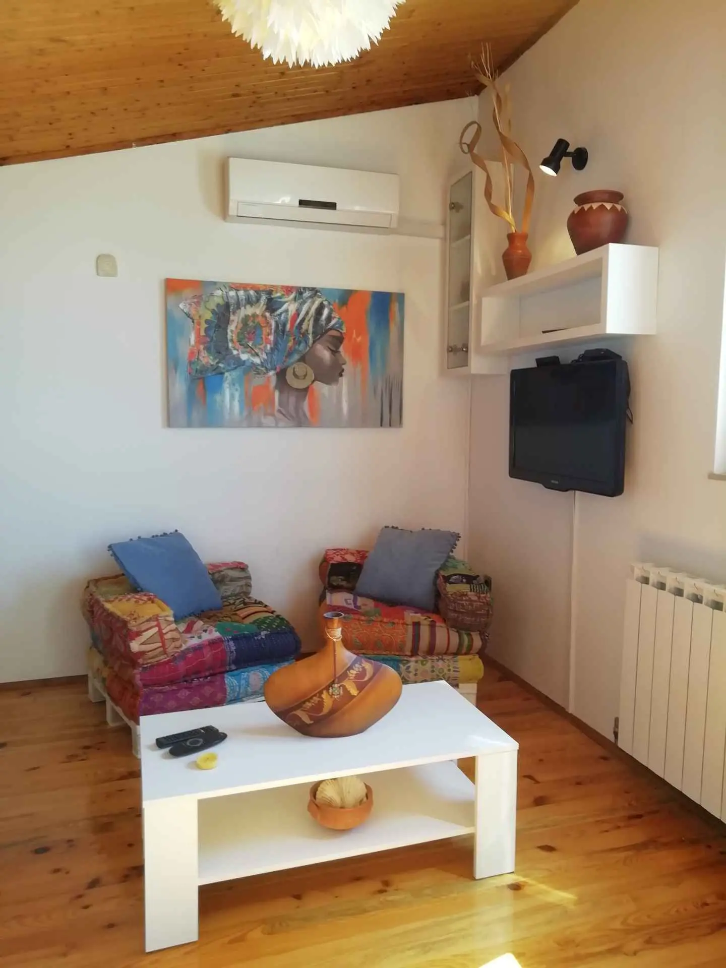 Het appartement voor twee personen, dat een klein kind kan krijgen, bevindt zich op de zolder van een gezinswoning en heeft een terras van 25 m2, dat is uitgerust met een grote eettafel, een speciale set om 's ochtends te genieten van koffie, ligstoelen en een douche. Het is de enige ruimte die we in het huis huren, dus de privacy is gewaarborgd, evenals de privacy van het gebruik van de grote mediterrane tuin en barbecue, en een badmintonveld. Het strand ligt op twee minuten lopen van het huis en naast het strand zijn er sportfaciliteiten: een volleybal- en voetbalveld. Accommodatie is inclusief gratis parkeren