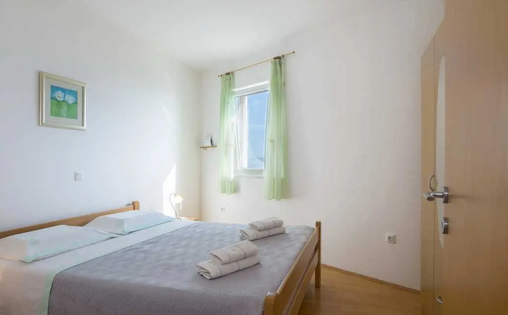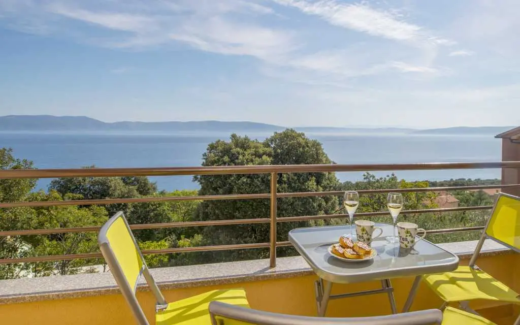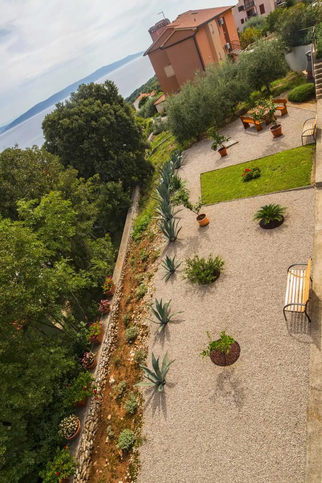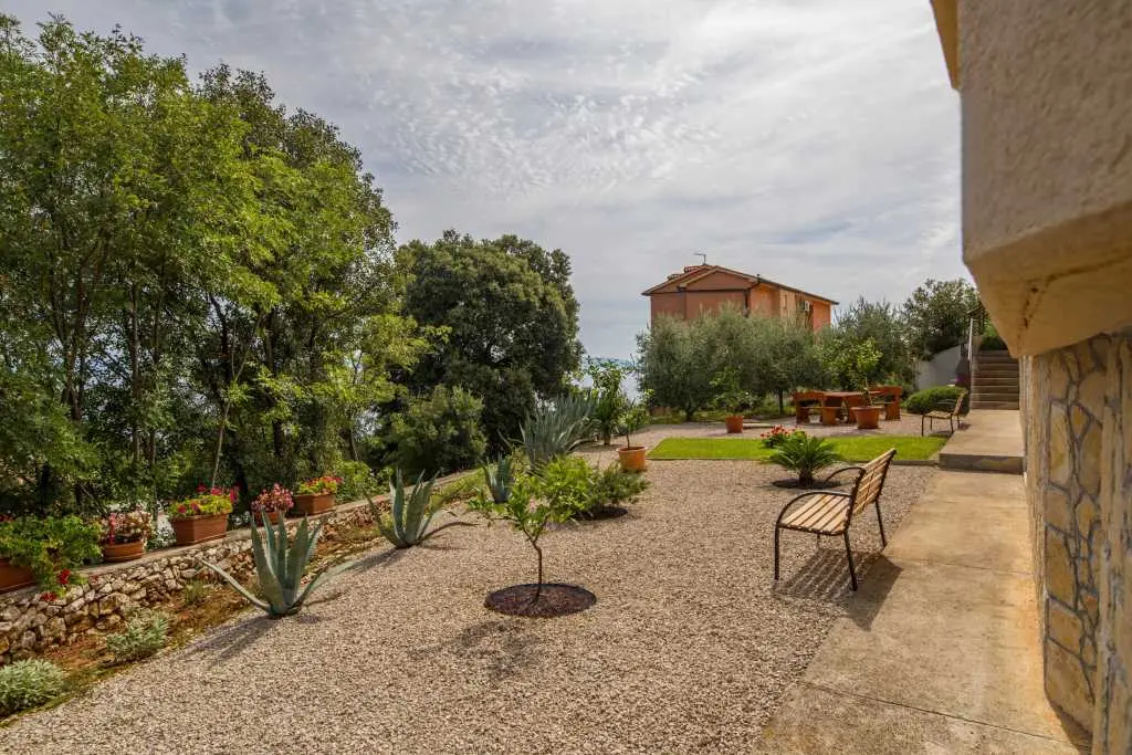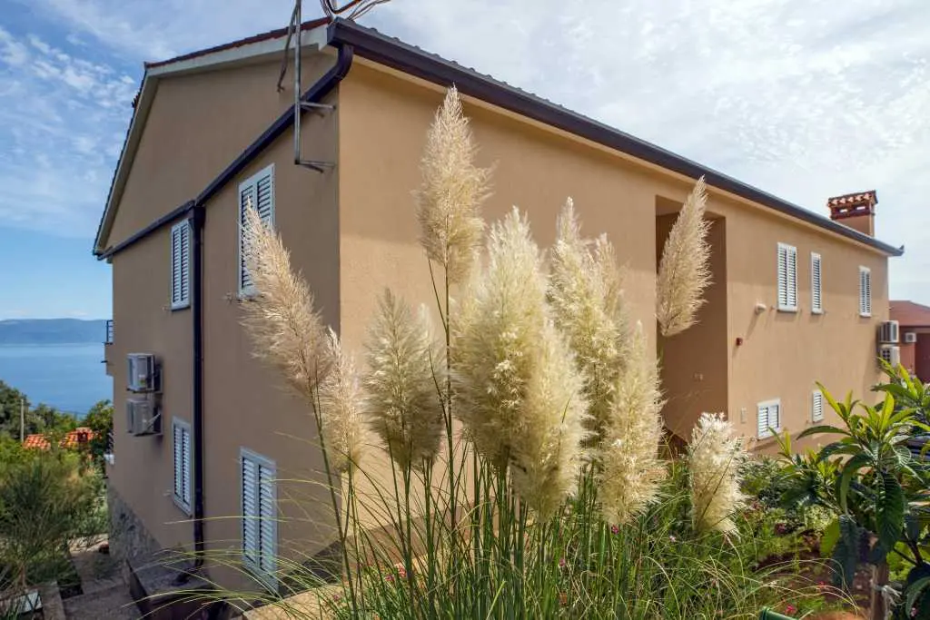 Een heel mooi gebouw in het kleine stadje Drenje aan de oostkust van het schiereiland Istrië bestaat uit drie appartementen. Twee appartementen bevinden zich op de bovenste verdieping en hebben twee slaapkamers, keuken, badkamer en balkon met een fantastisch uitzicht op de zee en het eiland Cres in de verte. Het onderste appartement heeft een slaapkamer, keuken, badkamer en terras met uitzicht op de zee. Het huis is nieuw gebouwd en heeft een prachtige omgeving met een park en een bankje om uit te rusten. Er is ook een buitenbarbecue met een grote tafel en een zitbank die gebruikt kan worden. Afstand tot het strand is ongeveer 1 km waar een restaurant is dat uitstekend eten en drinken biedt.
