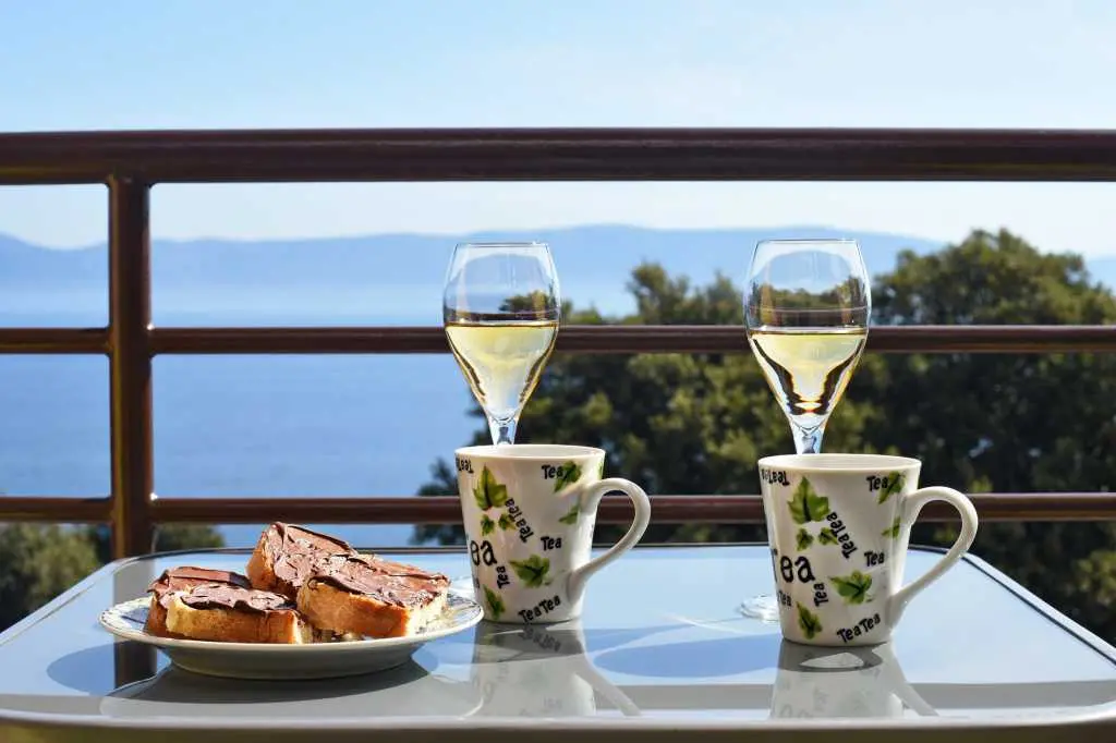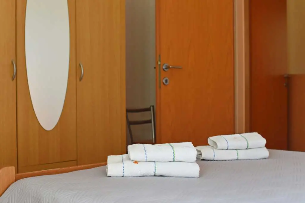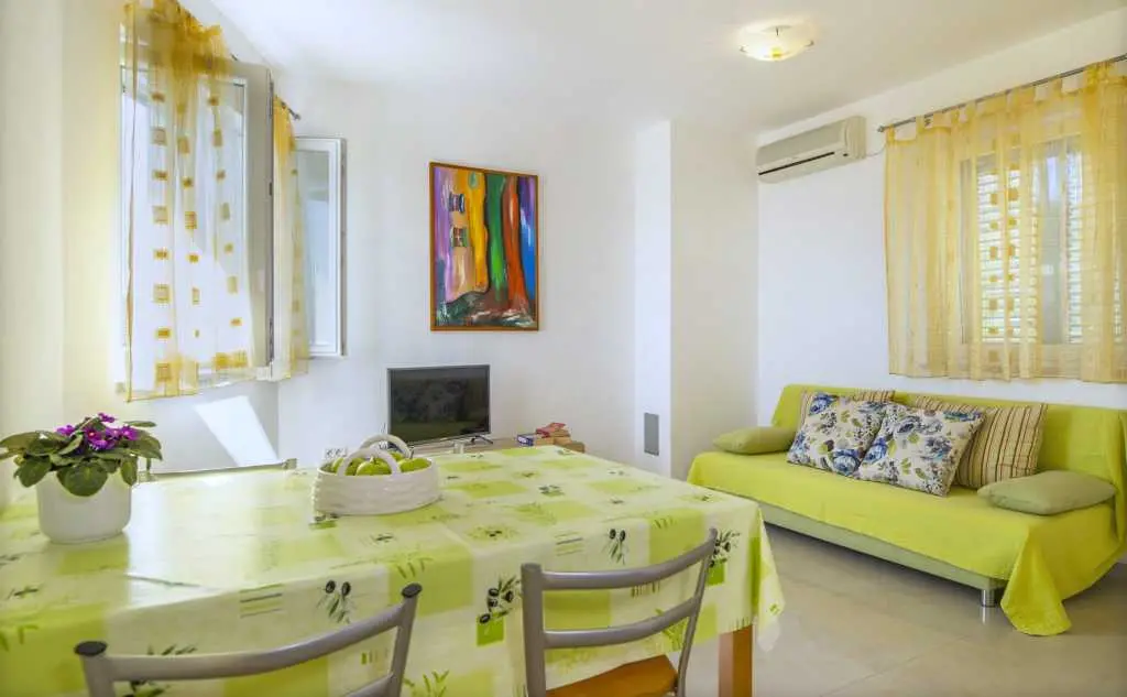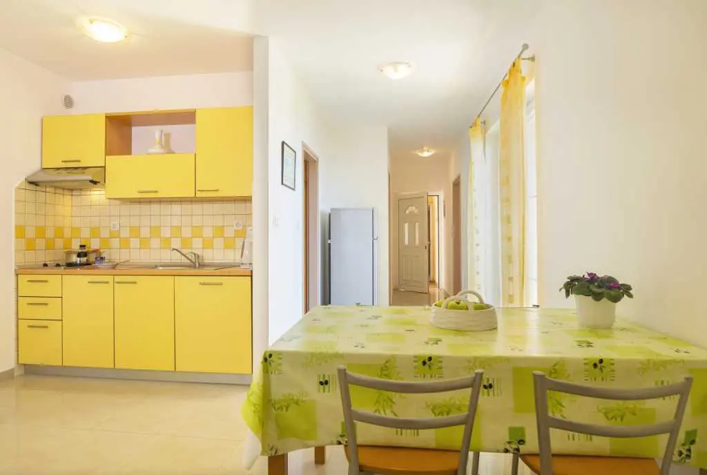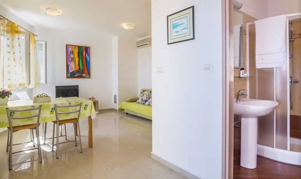 Een heel mooi gebouw in het kleine stadje Drenje aan de oostkust van het schiereiland Istrië bestaat uit drie appartementen. Twee appartementen bevinden zich op de bovenste verdieping en hebben twee slaapkamers, keuken, badkamer en balkon met een fantastisch uitzicht op de zee en het eiland Cres in de verte. Het onderste appartement heeft een slaapkamer, keuken, badkamer en terras met uitzicht op de zee. Het huis is nieuw gebouwd en heeft een prachtige omgeving met een park en een bankje om uit te rusten. Er is ook een buitenbarbecue met een grote tafel en een zitbank die gebruikt kan worden. Afstand tot het strand is ongeveer 1 km waar een restaurant is dat uitstekend eten en drinken biedt.