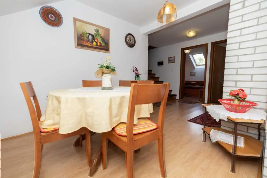 Appartement *** Eigenaar Zarko Svetlici Vrh 44 51314 Ravna Gora. Appartement met centrale verwarming. Beschikbare woonkamer. Volledig ingerichte keuken, eetkamer, twee slaapkamers + Zolderkamer met vijf bedden, badkamer en toilet. Roken.