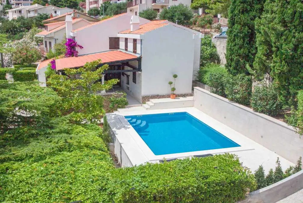 Villa Skalinada is gelegen in het pittoreske stadje Baška Voda aan de Makarska Riviera. Deze charmante villa biedt comfortabel plaats aan 8 personen. De eerste verdieping bestaat uit twee tweepersoonsslaapkamers, twee eenpersoonsslaapkamers en twee badkamers. Een met een douche (afmeting 80 x 80 cm) en een met een bad (afmeting 100 x 55 cm). Een van de tweepersoonsslaapkamers is een hoofdslaapkamer met een tweepersoonsbed (afmeting 160 x 190 cm), een eigen badkamer (met douche), een kluisje en een uitgang naar een overdekt balkon met prachtig uitzicht op zee. De andere tweepersoonsslaapkamer heeft een bed van 140 x 190 cm, terwijl de bedden in de eenpersoonskamers respectievelijk 90 x 200 cm en 90 x 190 cm zijn. Elke slaapkamer op de eerste verdieping heeft uitzicht op zee. De villa is gedeeltelijk voorzien van airconditioning. De villa is in totaal uitgerust met 5 A / C-units. Alle 3 tweepersoonsslaapkamers zijn uitgerust met elk een unit, terwijl de andere twee units zich respectievelijk in de keuken op de begane grond en in de hal op de eerste verdieping bevinden. Het buitenterrein van de villa omvat een zwembad (24 m2) met een zonneterras met 8 ligstoelen, een overdekt terras met een tafel en 8 stoelen, een tuin en een gedeelte met kinderspeelgoed. De villa is bereikbaar met de auto, maar het stadscentrum en handige voorzieningen bevinden zich op loopafstand. Bijvoorbeeld een bakkerij, een postkantoor, een café en een apotheek. Dit is mogelijk dankzij de kleine trap die naar het centrum leidt. Villa biedt 2 gratis parkeerplaatsen voor hun gasten, op 100 m van de accommodatie. Bovendien is de zee slechts 160 meter verwijderd door middel van deze trappen. Het minimum aantal nachten is 5, en in juli en augustus 7. Neem voor meer informatie gerust contact met ons op.
